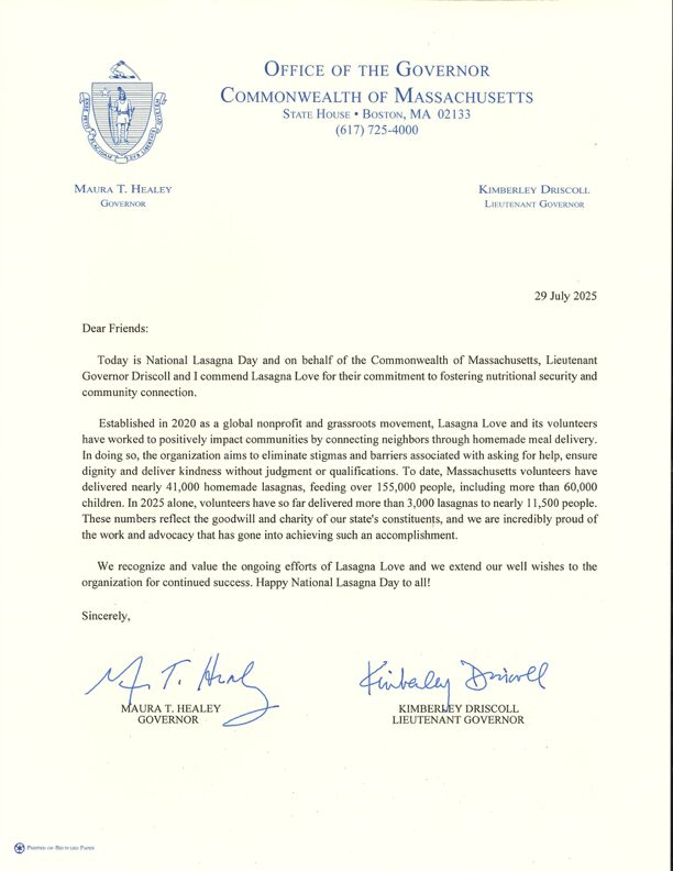 Boston, MA (July 7, 2025) – In celebration of National Lasagna Day on July 29, 2025, Governor Maura T. Healey and Lieutenant Governor Kimberley Driscoll have formally commended Lasagna Love for its ongoing commitment to fostering nutritional security, volunteerism, and community connection across the Commonwealth.